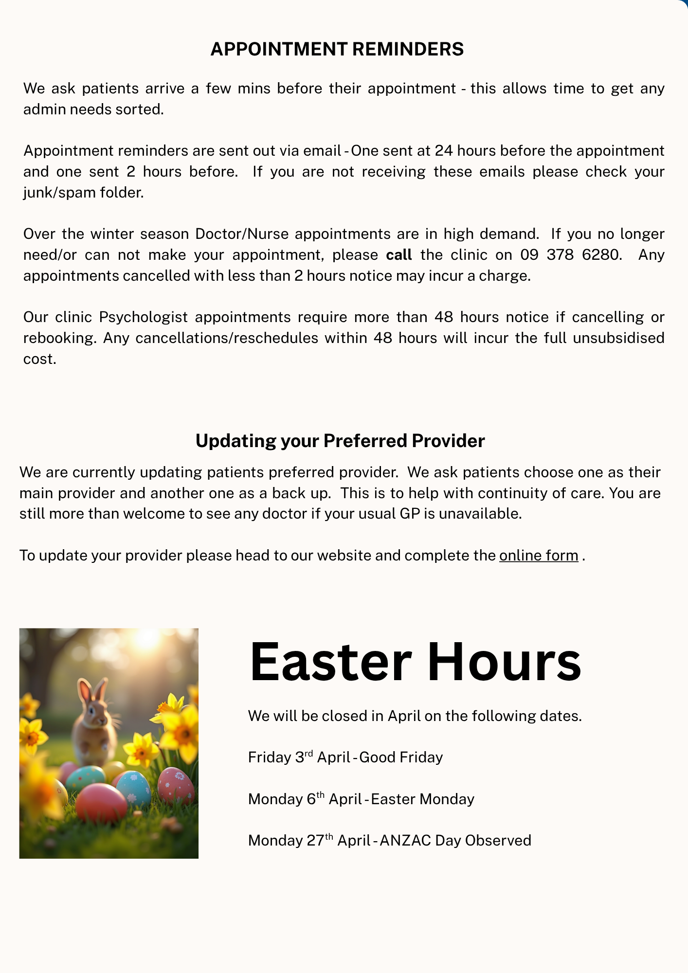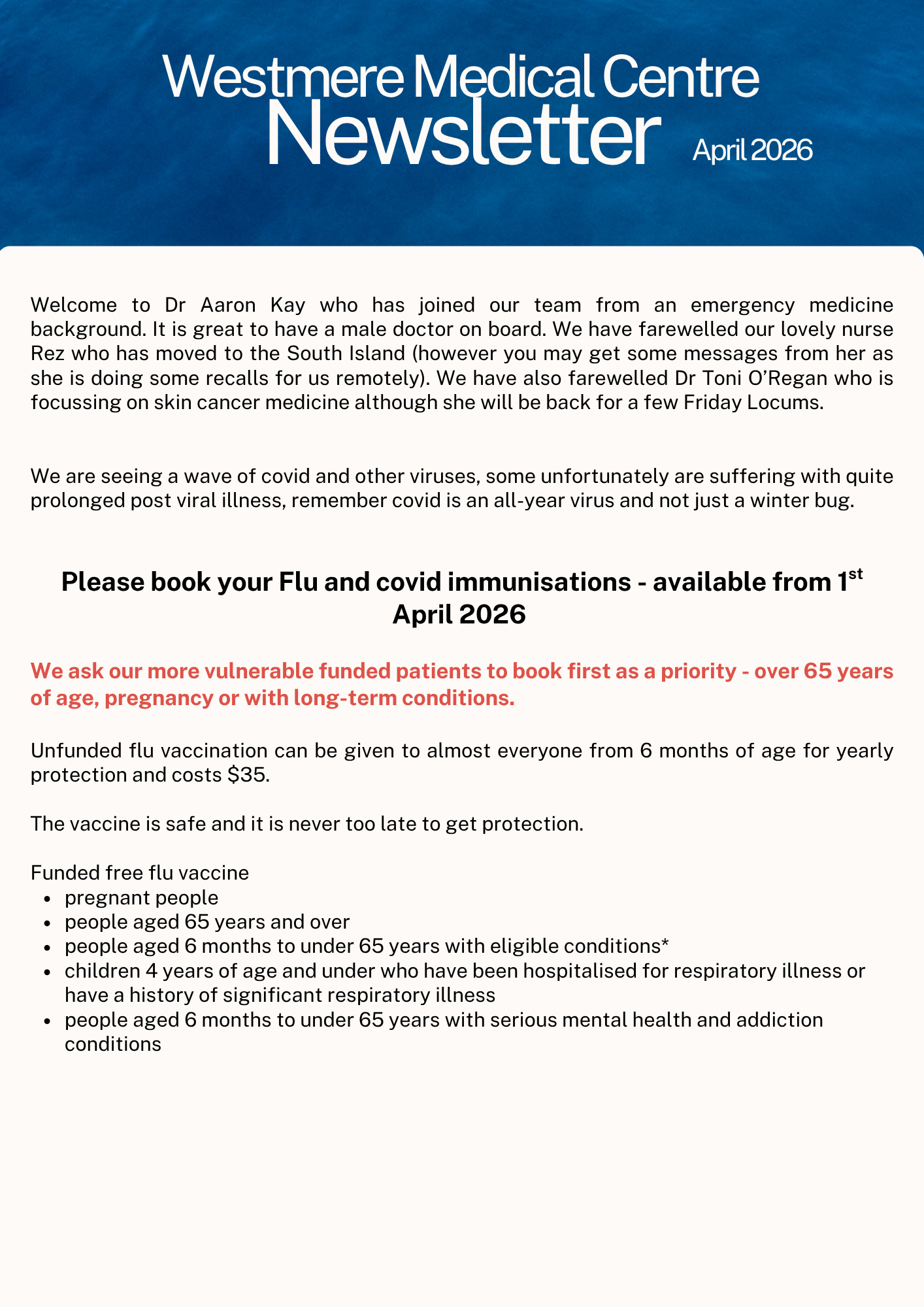 We hope you have had a wonderful summer break and are ready for 2026! The team at Westmere Medical Centre is are looking forward to caring for you during the next year.