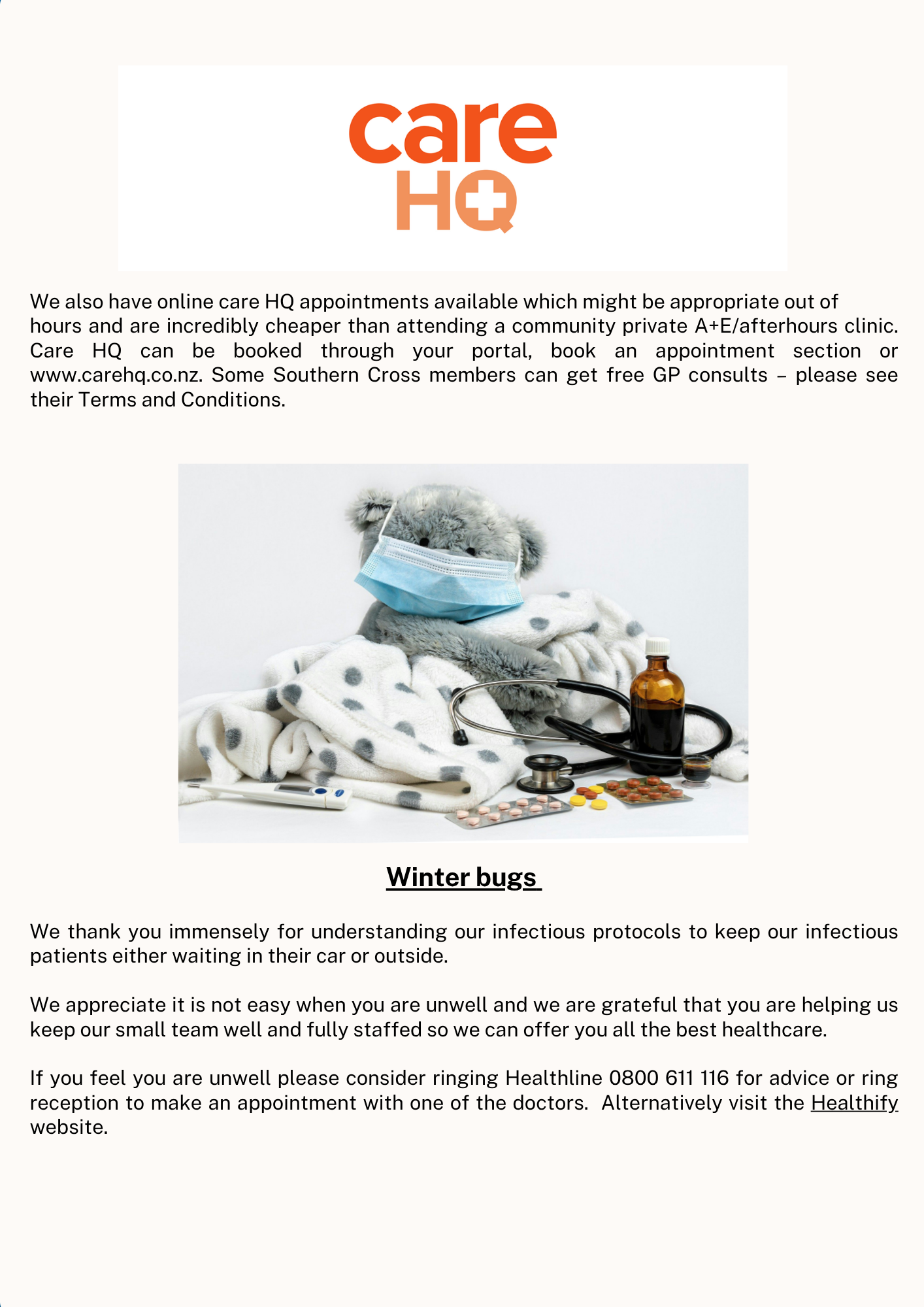 There are currently cases of Measles, Pertussis (Whooping Cough) and Covid in the community. If you are not sure, please call the clinic on 09 3786280 and option 3 to speak to a nurse.
